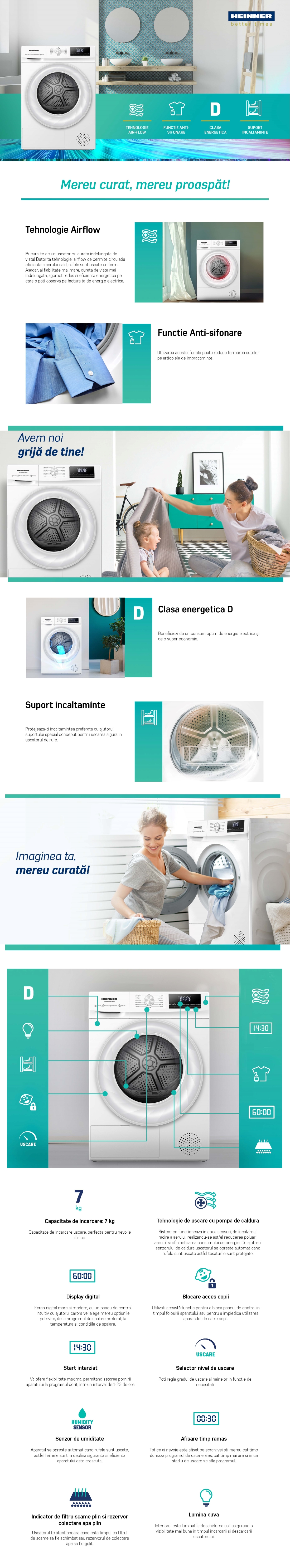 USCATOR DE RUFE CU POMPA DE CALDURA HEINNER HHPD-HMY70FD++, CAPACITATE INCARCARE 7KG, CLASA ENERGETICA D, DISPLAY DIGITAL, LUMINA CUVA, 15 PROGRAME, SUPORT INCALTAMINTE, PROGRAM BABY CARE, PROGRAM LANA, PROGRAM ECO, FUNCTIE ANTI SIFONARE, SELECTOR NIVEL USCARE, BLOCARE ACCES COPII, INDICATOR CURATARE FILTRU SCAME, INDICATOR REZERVOR COLECTARE APA PLIN, DIMENSIUNI(LxAxI): 59.5x58x84.5, CULOARE: ALB