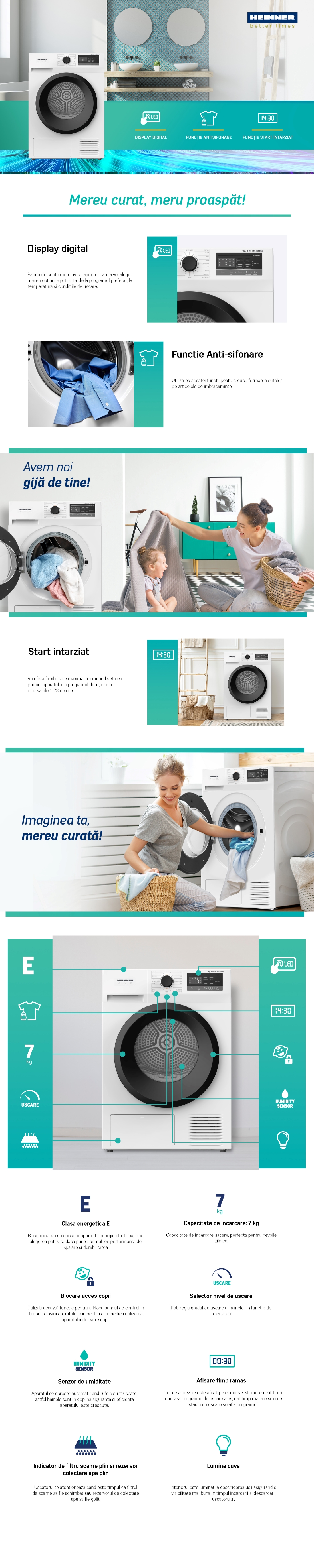 USCATOR DE RUFE CU POMPA DE CALDURA HEINNER HHPD-M7N13PBKE++, CAPACITATE INCARCARE 7KG, CLASA ENERGETICA E, 16 PROGRAME DE USCARE, DISPLAY LED, PROGRAM RAPID CAMASI, FUNCTIE START INTARZIAT, FUNCTIE ANTI-SIFONARE, LUMINA CUVA, SELECTOR NIVEL USCARE, INDICATOR CURATARE FILTRU SCAME, INDICATOR REZERVOR COLECTARE APA PLIN, HUBLOU USA PLASTIC, BLOCARE ACCES COPII, DIMENSIUNI ( LXAXI): CM, CULOARE: ALB