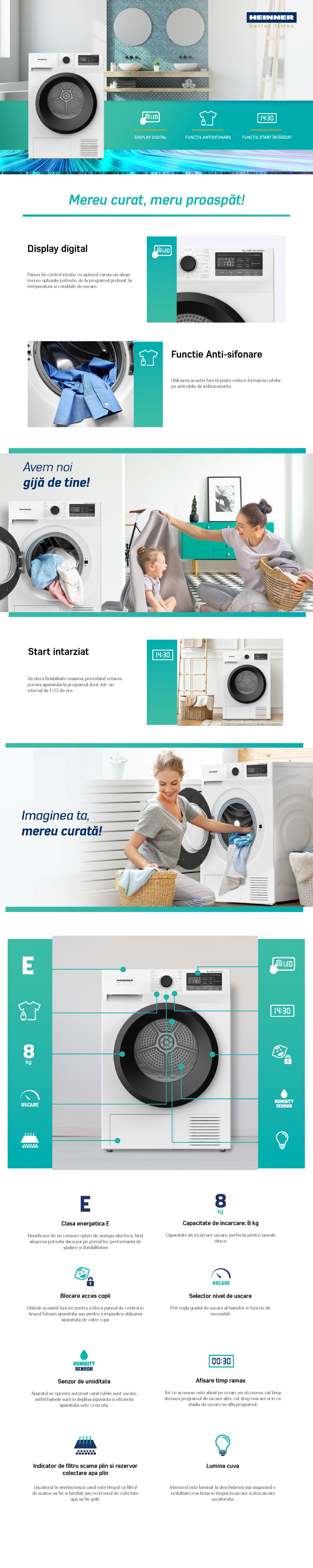 USCATOR DE RUFE CU POMPA DE CALDURA HEINNER HHPD-M8N13PBKE++, CAPACITATE INCARCARE 8KG, CLASA ENERGETICA E, 16 PROGRAME DE USCARE, DISPLAY LED, PROGRAM RAPID CAMASI, FUNCTIE START INTARZIAT, FUNCTIE ANTI-SIFONARE, LUMINA CUVA, SELECTOR NIVEL USCARE, INDICATOR CURATARE FILTRU SCAME, INDICATOR REZERVOR COLECTARE APA PLIN, HUBLOU USA PLASTIC, BLOCARE ACCES COPII, DIMENSIUNI ( LXAXI): CM, CULOARE: ALB