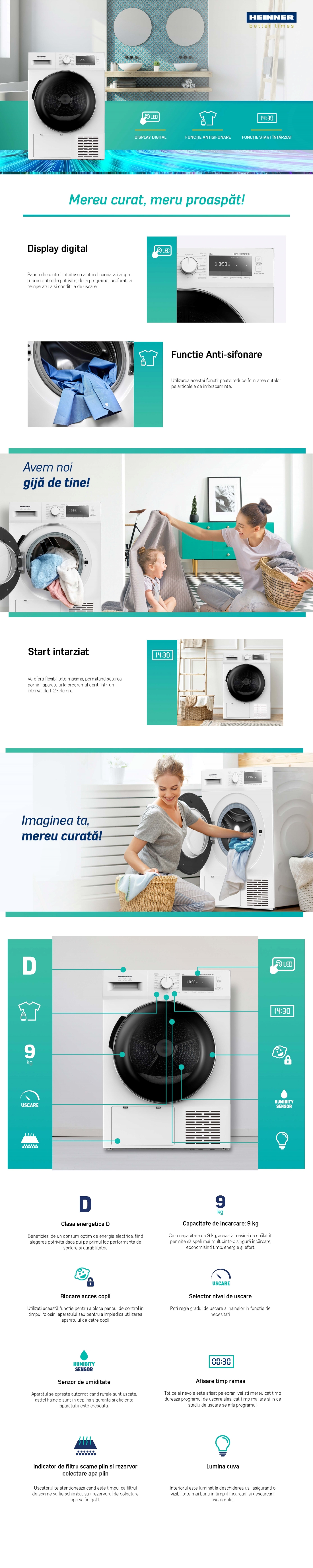 USCATOR DE RUFE CU POMPA DE CALDURA HEINNER HHPD-M9G5PBKD++, CAPACITATE INCARCARE 9KG, CLASA ENERGETICA D, 16 PROGRAME DE USCARE, DISPLAY LED, PROGRAM RAPID CAMASI, FUNCTIE START INTARZIAT, FUNCTIE ANTI-SIFONARE, LUMINA CUVA, SELECTOR NIVEL USCARE, INDICATOR CURATARE FILTRU SCAME, INDICATOR REZERVOR COLECTARE APA PLIN, HUBLOU USA PLASTIC, BLOCARE ACCES COPII, DIMENSIUNI ( LXAXI): 59.5 x 67.5 x 85.0 CM, CULOARE: ALB