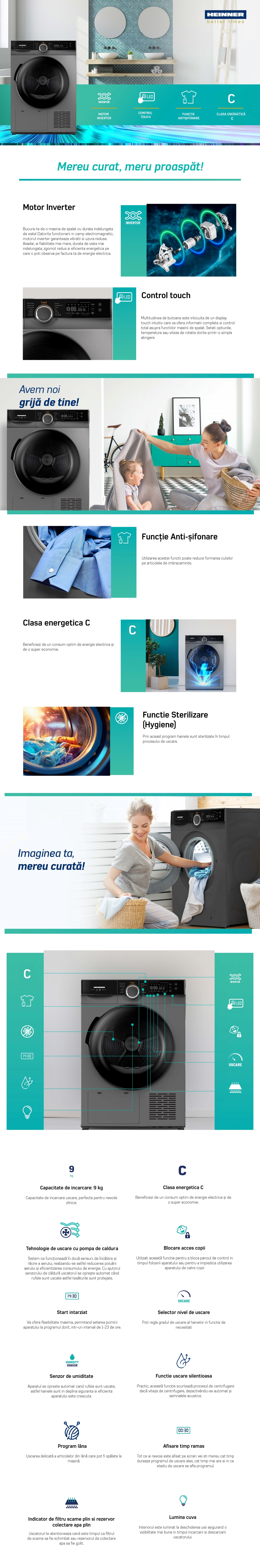 USCATOR DE RUFE CU POMPA DE CALDURA HEINNER HHPD-M9K3SA+++, CAPACITATE INCARCARE 9KG, CLASA ENERGETICA C, MOTOR INVERTER, 14 PROGRAME, CONTROL TOUCH, DISPLAY DIGITAL, PROGRAM BABY CARE, PROGRAM LANA, PROGRAM STERILIZARE, FUNCTIE ANTI-SIFONARE, MEMORARE PROGRAM PREFERAT, LUMINA CUVA, SELECTOR NIVEL USCARE, INDICATOR CURATARE FILTRU SCAME, INDICATOR REZERVOR COLECTARE APA PLIN, BLOCARE ACCES COPII, DIMENSIUNI ( LXAXI): 59.5X67.5X84.5 CM, CULOARE: ARGINTIU