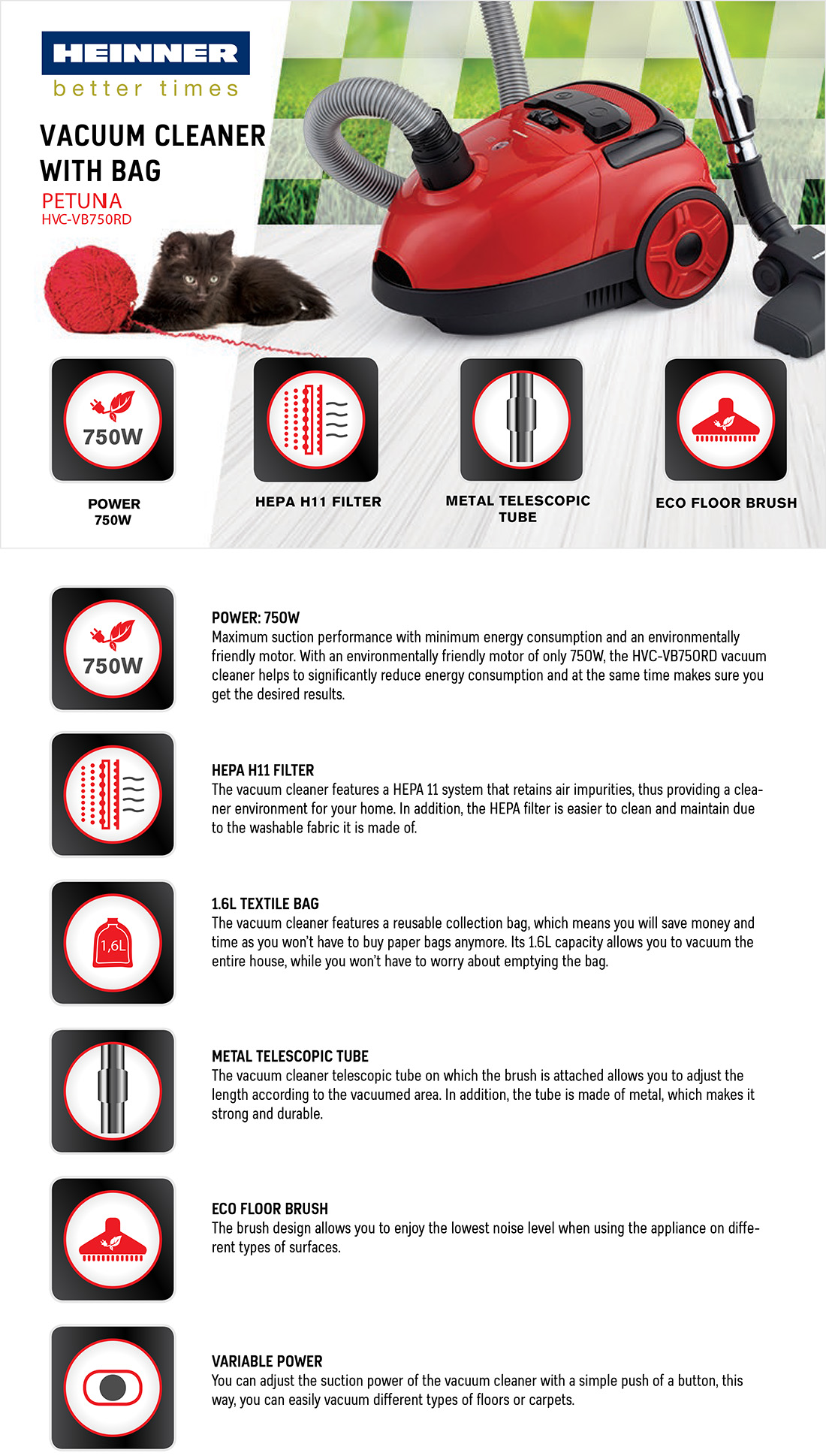 Vacuum cleaner Heinner Petunia HVC-VB750RD, 750W, H11 HEPA filter, suction power: > 180W, dust bag capacity 1.6 l, metal telescopic tube, eco floor brush, variable power control, accessory: sofa brush, crevice brush, automatic cord rewinder, red