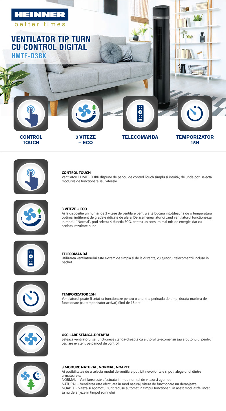 Ventilator turn digital, control digital, 3 viteze + ECO, temporizator 15h, 3 moduri: natu